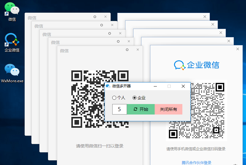 【微信多开器免费版】是一个支持企业微信、电脑微信的多开神器,特别适合那种公司业务需要、要多开企业微信的用户,将自用的个人微信多开器改造了一下,需要的朋友自取。微信多开器免费版实现了端口多开,提高用户微信的使用效率。